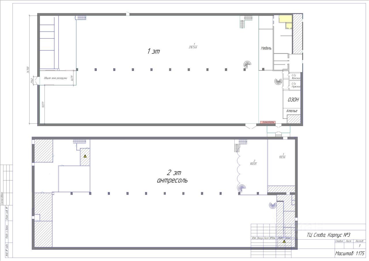 Общая S помещения: 3 663,7 кв.м Площадь делится: - на основную - 1 этаж - на офисный блок - антресольный этаж.