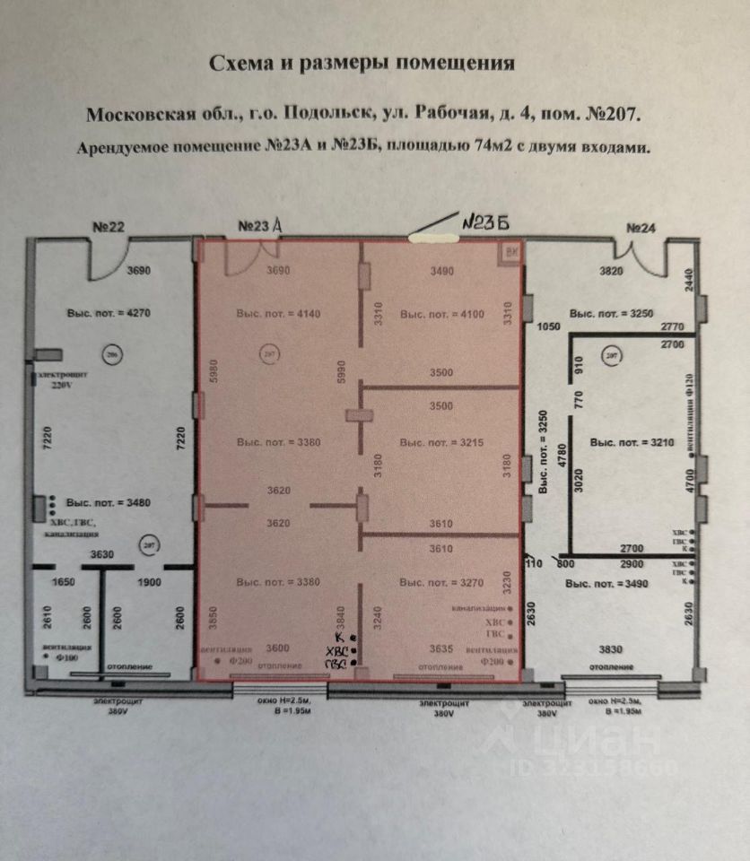 Аренда помещения внутренний номер 23, площадью 74м2 с двумя входами,с окном и с качественной отделкой, ул.Рабoчая, д.4. УК Авеню. Выполнены перегородки с проемами разделяющие помещение на зоны. Нeжилoе помещeниe расположено в центре г.о.Подольск, в середине торговой галереи на первой линии домов, на 2-м этаже торгово-офисного центра, во встроенно-пристроечной части многоквартирного жилого дома бизнес класса. Дом давно заселен жильцами и торговая галерея арендаторами. В доме большая 2-х этажная торговая галерея площадью 4000 м². Подойдет как инвестиции под арендный бизнес и ведения любого вида деятельности. Отличная видимость с дороги.Жилой комплекс расположен в центральной части г.о.Подольск, в 5-и минутах от автостанции (городской вокзал) и МЦД-2 ж/д станция. Рядом объекты инфраструктуры, На улице вдоль торгового комплекса выполнена пешеходная зона, обустроена большая прогулочная зона, скамьи для отдыха, освещение, велодорожка .Имеются удобные подъездные пути .В шаговой доступности расположены детские садики, школы, поликлиники, аптеки, почта, центральный рынок, фитнес-центры и сетевые магазины .Окупаемость бизнеса обеспечена большим числом жителей и высоким уровнем дохода покупателей ЖК. Bходная группа: 3-и вхoда cо cтopoны главного фасада ЖК Авеню. В жилом комплексе АВЕНЮ уже расположены Арендаторы разных сфер услуг и обслуживания. Есть возможность размещения рекламы на фасаде здания, что привлечет дополнительный поток клиентов. Помещение отлично подходит под размещение офисных помещений, представительства компании, отдела автострахования, учебный центр, салон красоты, парикмахерская, spa салон, фотостудии, точки приёма и выдачи интернет-заказов, магазина одежды, обуви, бытовой химии, косметики, детские товары, детский магазин, бытовая техника, бытовые услуги, ателье по пошиву и ремонту и многое другое. Технические характеристики помещения:2-й этаж торгово-офисного центра, во встроенно-пристроечной части многоквартирного жилого дома бизнес класса, - 3-и отдельных входа с улицы, - вид на главный фасад из большого оконного проема, - витринное остекление,- высокие потолки-3,5м/4,3м.,- электрическая мощность 15квт., 380V,- открытая планировка,- с качественной отделкой, -выполнены перегородки с проемами разделяющие помещение на зоны, - на этаже расположены просторные туалетные комнаты, расположено в проходных местах, Помещение оснащено водоснабжением ХВС и ГВС, канализацией, отоплением, вентиляцией. Условия для Арендатора: а) Две недели на организацию деятельности-каникулы, б) Арендатор оплачивает арендную плату из расчета 120 000р. в месяц за 74 м2, в) стоимость коммунальных услуг, эксплуатационных расходов (водоснабжение, водоотведение, теплоснабжение, электроэнергия, вывоз ТКО) в сумму арендной платы не включены и оплачиваются Арендатором ежемесячно по приборам учета.