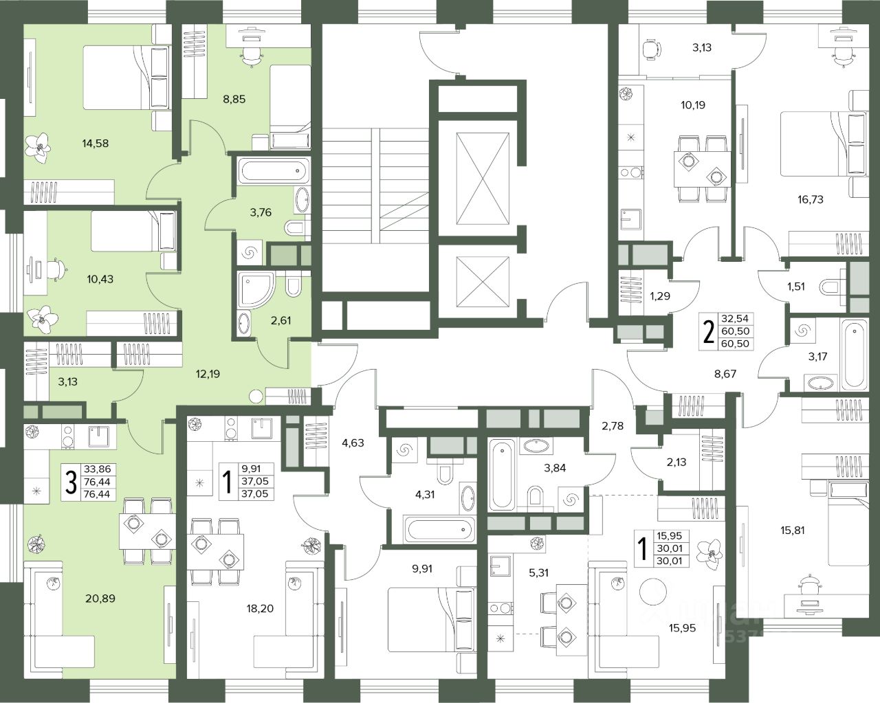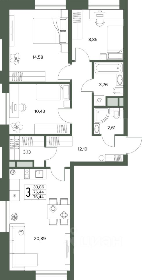 Общая площадь76,44 м2