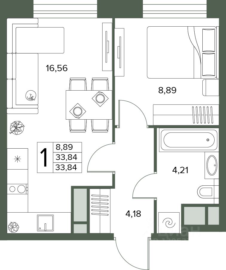 Общая площадь33,84 м2