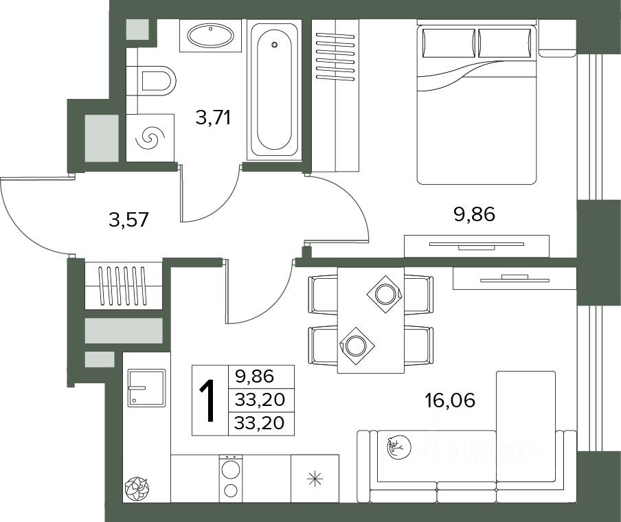 Общая площадь33,2 м2