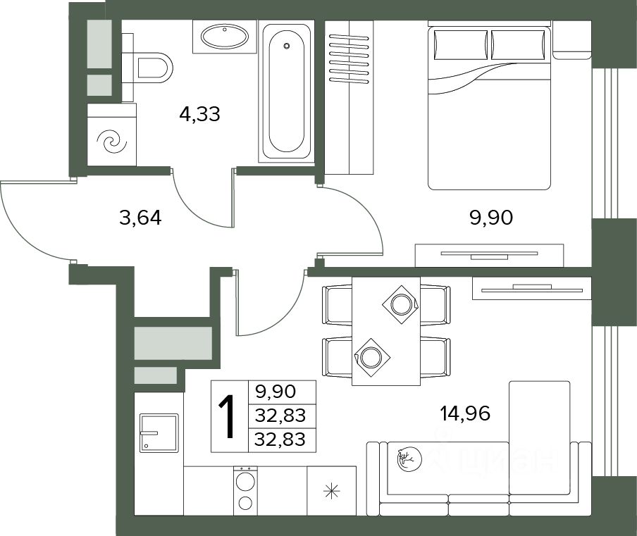 Общая площадь32,83 м2