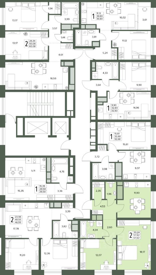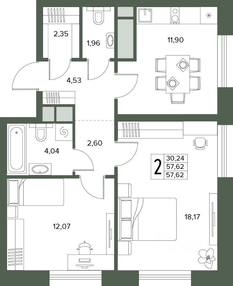 Общая площадь57,62 м2